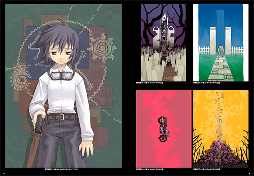 A selection of paintings and illustrations by Kuroboshi Kouhaku including work from Dengeki "Kino's Journey," "Gakuen Kino," "Allison," "Lillia and Treize" anime "Sky Girls", "Shigofumi: Letters from the Departed", games including the "Summon Night", commercial magazines, product packaging, anime end cards and more.